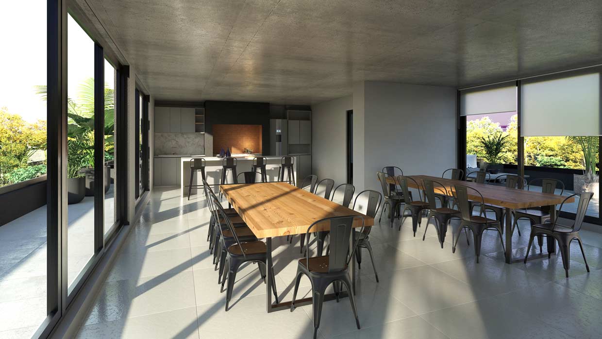 El segundo y tercer piso están compuestos por unidades monoambiente, de 1 dormitorio con parrillero y de 2 dormitorios con parrillero.